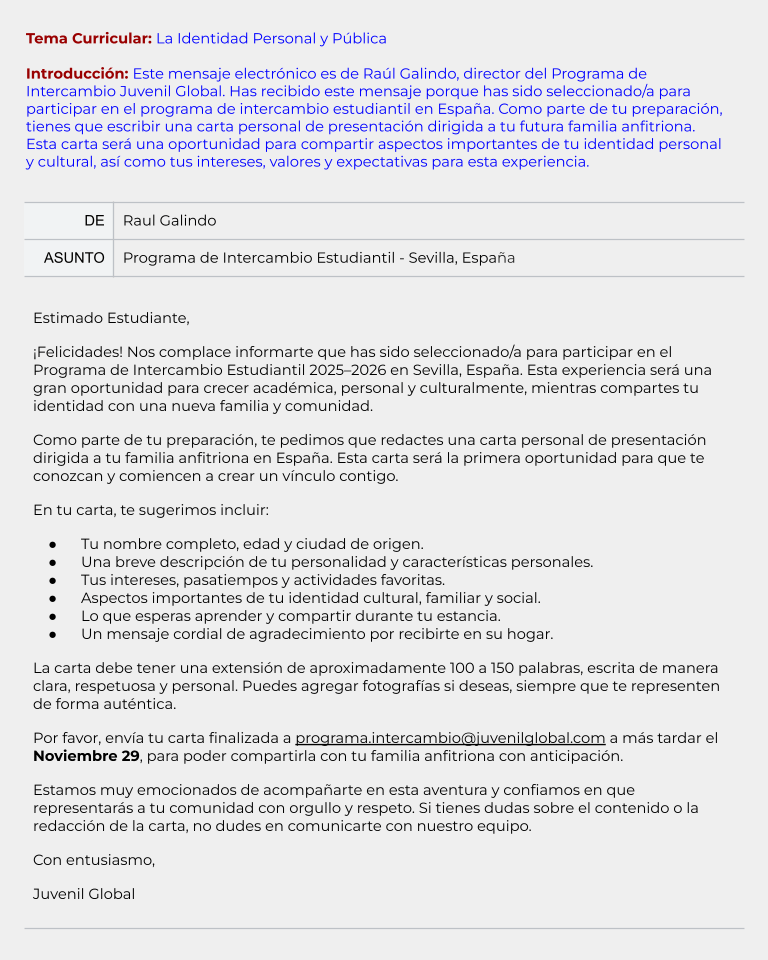Acabas de recibir un mensaje de la compañia Juvenil Global informándote que has sido seleccionado/a para participar en un programa de intercambio en España. La compañia colabora con EduQuality para crear experencias únicas para estudiantes.