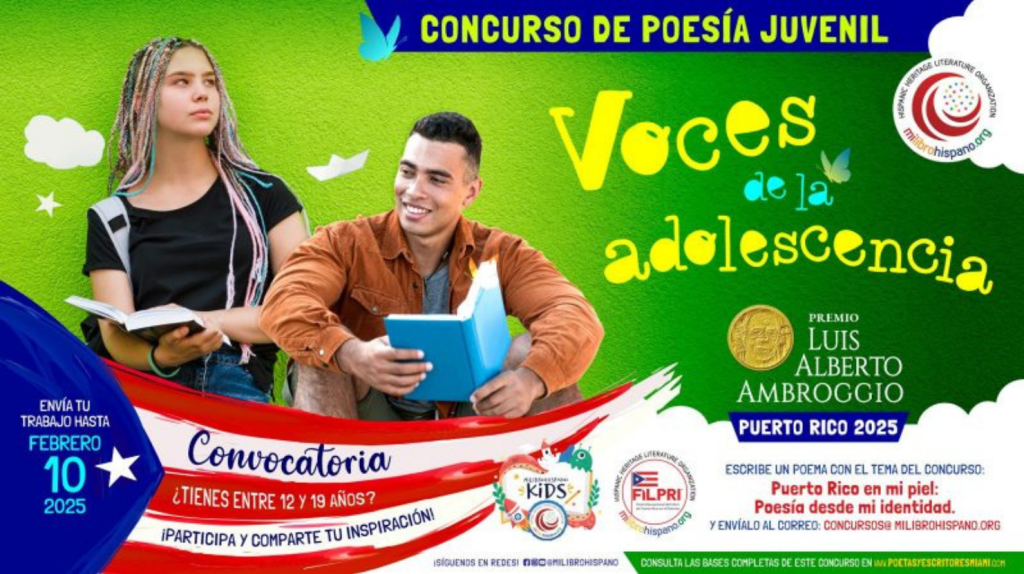 Voces de la Adolecencia invita a todos los jóvenes residentes en Puerto Rico a participar en un certamen literario, donde podrán expresar a través de sus palabras cómo perciben su isla y las razones por las que la aman. En sus versos, los participantes podrán plasmar aspectos como sus raíces culturales, paisajes, tradiciones y todo aquello que hace a Puerto Rico un lugar único y especial.