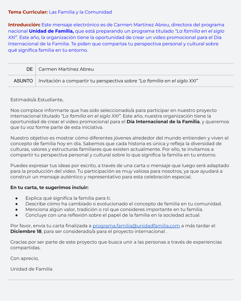 Imagina que recibiste un correo electrónico de una organización internacional que está preparando un programa titulado “La familia en el siglo XXI”. Este año, la organización tiene la oportunidad de crear el video promocional para el Día Internacional de la Familia. Te piden que compartas tu perspectiva personal y cultural sobre qué significa familia en tu entorno.